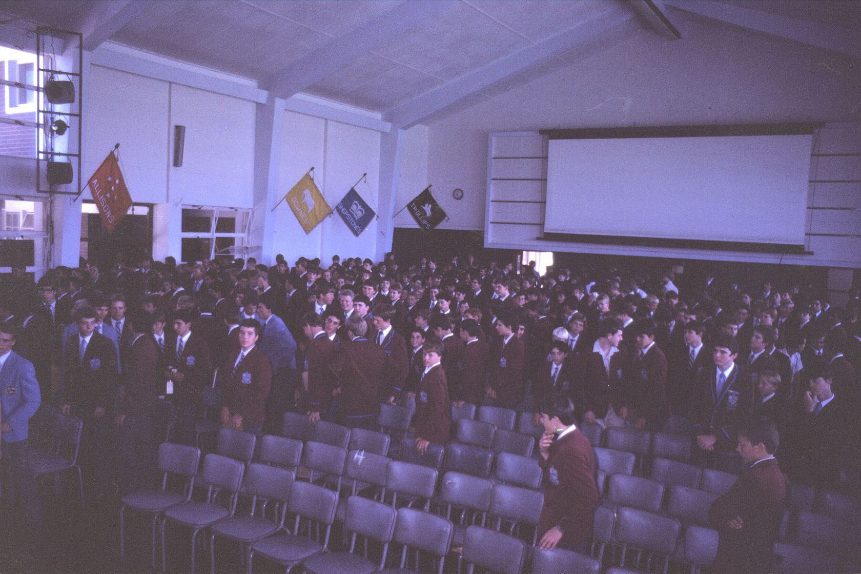 On a rare occasion in 1983, Alex's first basketball team was to play against one of our biggest rivals: Maritzburg College. Since the game was to be held at the nearby YMCA on a Friday afternoon, the school administration thought it would be a good idea to let students out early—requiring them to attend it in order to have a large crowd there representing the school and supporting the team. It was a great idea, since most students liked basketball anyway (more fun to watch than rugby ever was), and the bonus was that all homework for the day was canceled. Needless to say, I was in a very good mood—getting out of school early, and with no homework to worry about! I sat in the balcony, packed in like sardines among other Alex students, and waited for the teams to jog out onto the court.