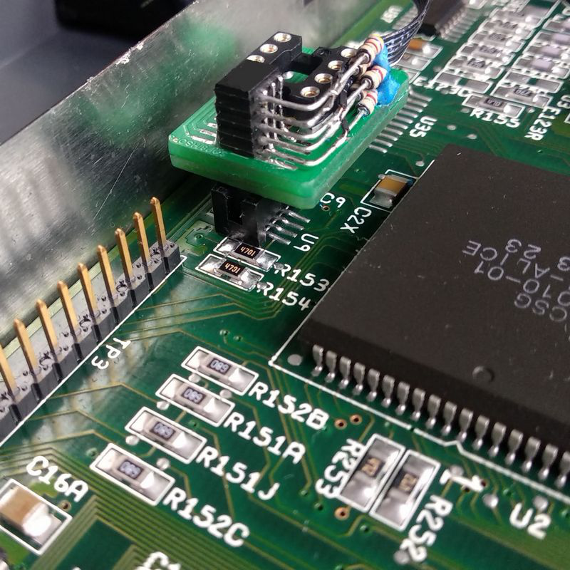 FRAM memories are mounted on the board, one on top of the other, you can also see the DIL08 socket installed for testing purposes.